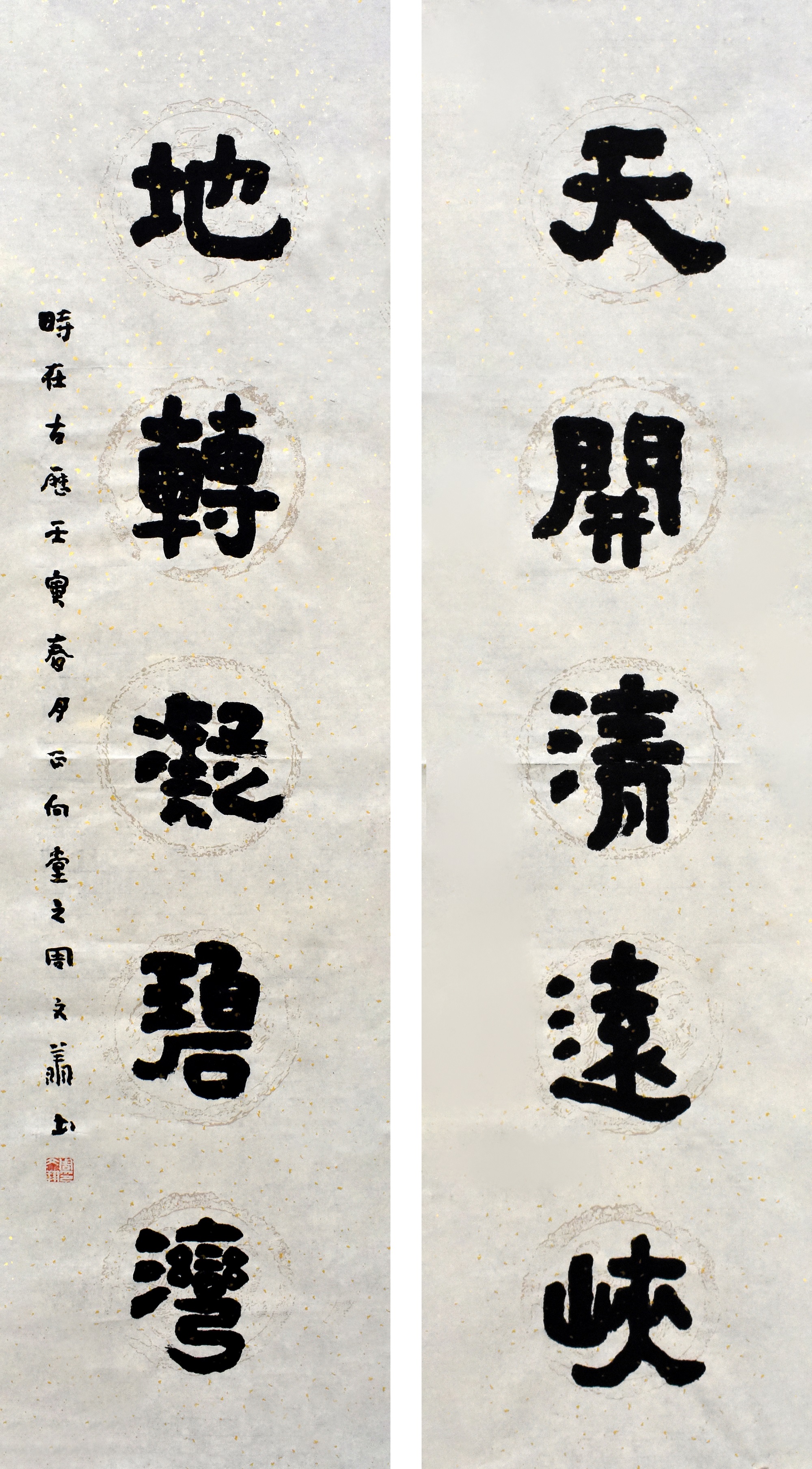 【字体】行书 【规格】 【年代】2020年(拟) 【性质】原创 【材质】纸质 【装裱】已装裱 【样式】对联 【作者】周文翔 【释文】天开清远峡,地转凝碧湾 【作品声明】一图一物,实物实图;字画为宣纸作品,毛边或裂痕或修补属于正常情况,不影响装裱效果,为方便邮寄,包装有折痕,但是在装裱时会拓平整的,不会影响装裱效果,请放心。 【作者简介】周文翔,清远市文化艺术创新发展协会会长,清远市书法家协会第五届副主席。